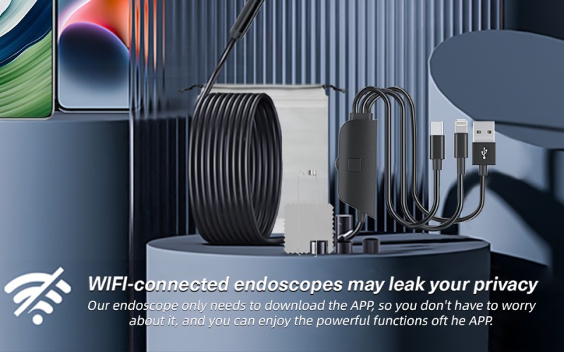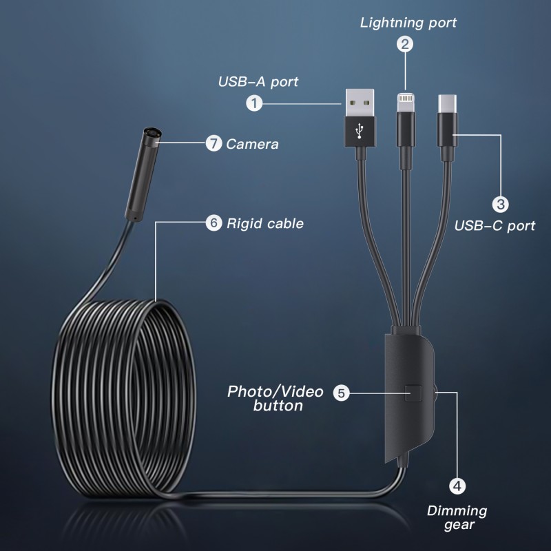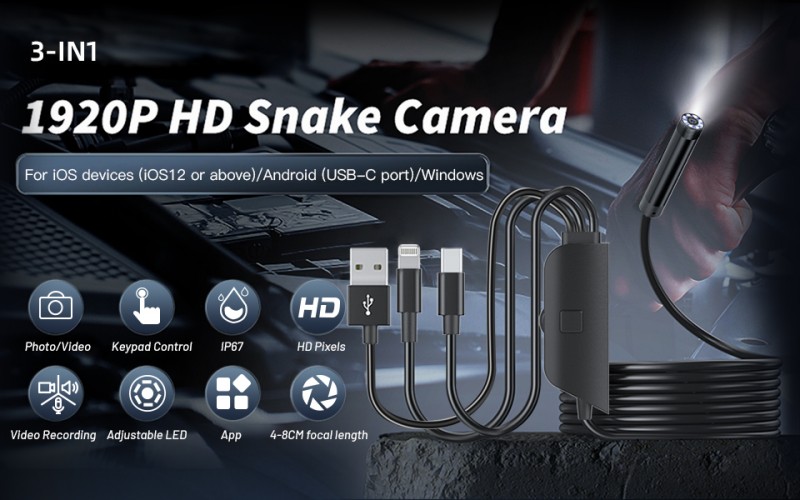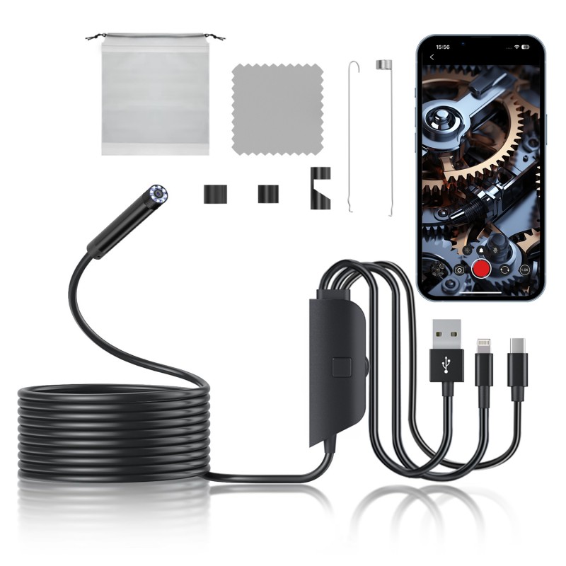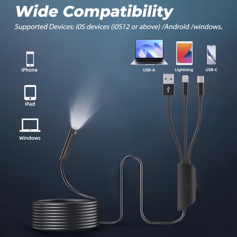 Whether professional engineers inspect large equipment, auto mechanics troubleshoot engine problems, or home users examine the internal structure of home appliances, this three-port direct-connect endoscope delivers "high-definition vision + strong illumination + full device compatibility" for precise, efficient, and reliable inspections, eliminating challenges with low light levels and device compatibility.