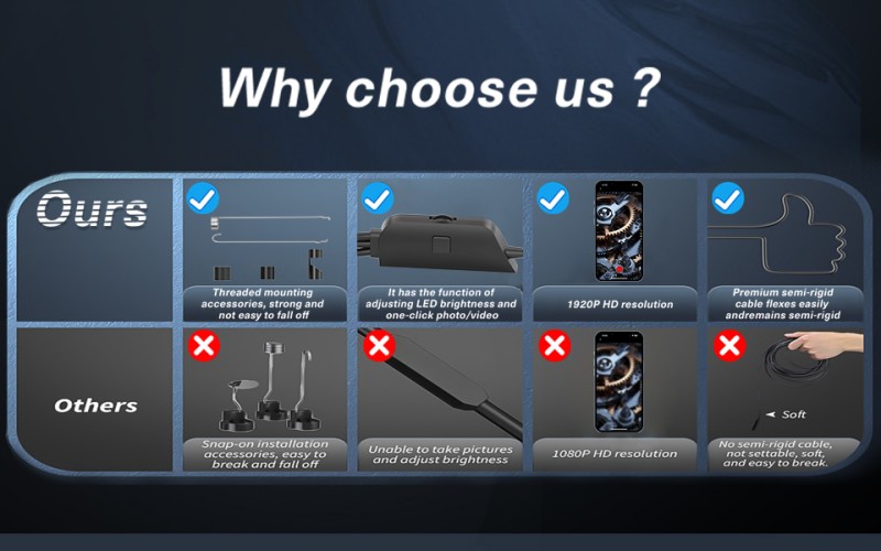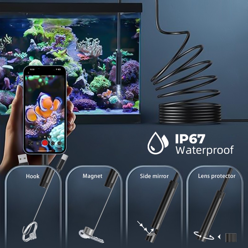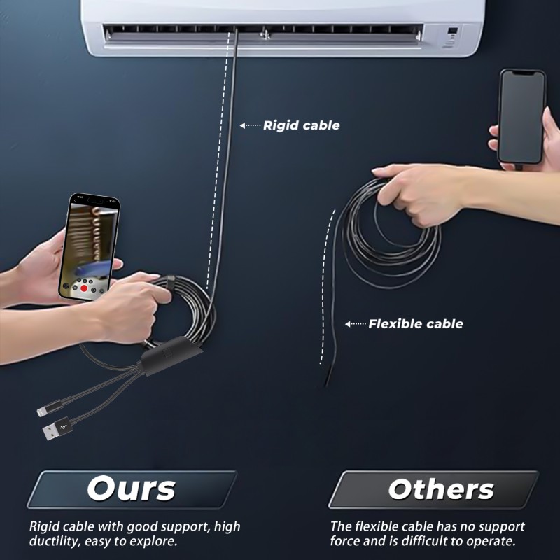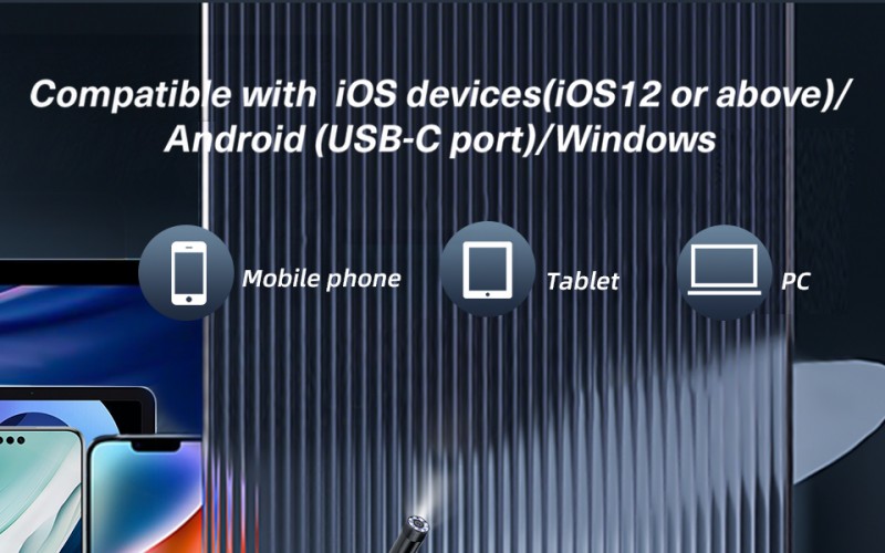 Direct connection to all devices, flexible switching across scenarios: The mobile version is suitable for outdoor emergency repairs and on-site inspections—use an Android phone to directly connect to check carbon deposits inside the engine during auto repairs, or use an iPhone to observe internal corrosion in real time during pipeline inspections. The desktop version is suitable for precise analysis and data archiving—connect to a desktop computer to zoom in on the image to observe subtle cracks, or connect to a laptop to organize inspection reports. A single camera can meet multiple needs, eliminating the need for separate tools for different devices. Extreme durability, adaptable to extreme environments: The 8.0mm slim probe easily enters spaces as narrow as 10mm in diameter. IP67 waterproof rating ensures stable operation underwater and in oily environments. From automotive transmissions to air conditioning ducts, from mechanical bearings to the interior of walls, it can provide in-depth inspections, becoming a "third eye" for industrial maintenance.