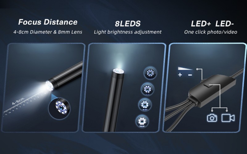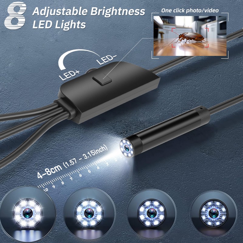 8 LEDs with stepless dimming, providing comprehensive light coverage: Compared to traditional 6 LEDs, 8 Each LED provides stronger light intensity and a wider illumination range, instantly piercing dim cavities and illuminating shadowed corners within complex structures. It supports stepless dimming for precise light control, reducing brightness to prevent glare in bright environments. Combined with automatic white balance and exposure adjustment, it maintains a clear field of view and ensures inspection accuracy.