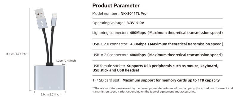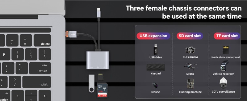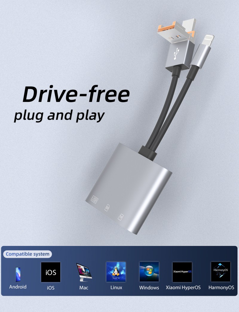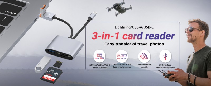ZOIOT's 3-in-1 Multi-Function Card Reader integrates three major interfaces: USB, Lightning, and Type-C. It supports dual SD and TF cards simultaneously and comes with a USB expansion port (compatible with a USB flash drive, keyboard, or mouse). It's plug-and-play and requires no drivers. It easily connects data between computers, Apple devices, and Android devices, efficiently processing files from camera and mobile phone memory cards while also expanding peripherals for increased efficiency. It's the perfect portable data assistant for photography enthusiasts and mobile workers.