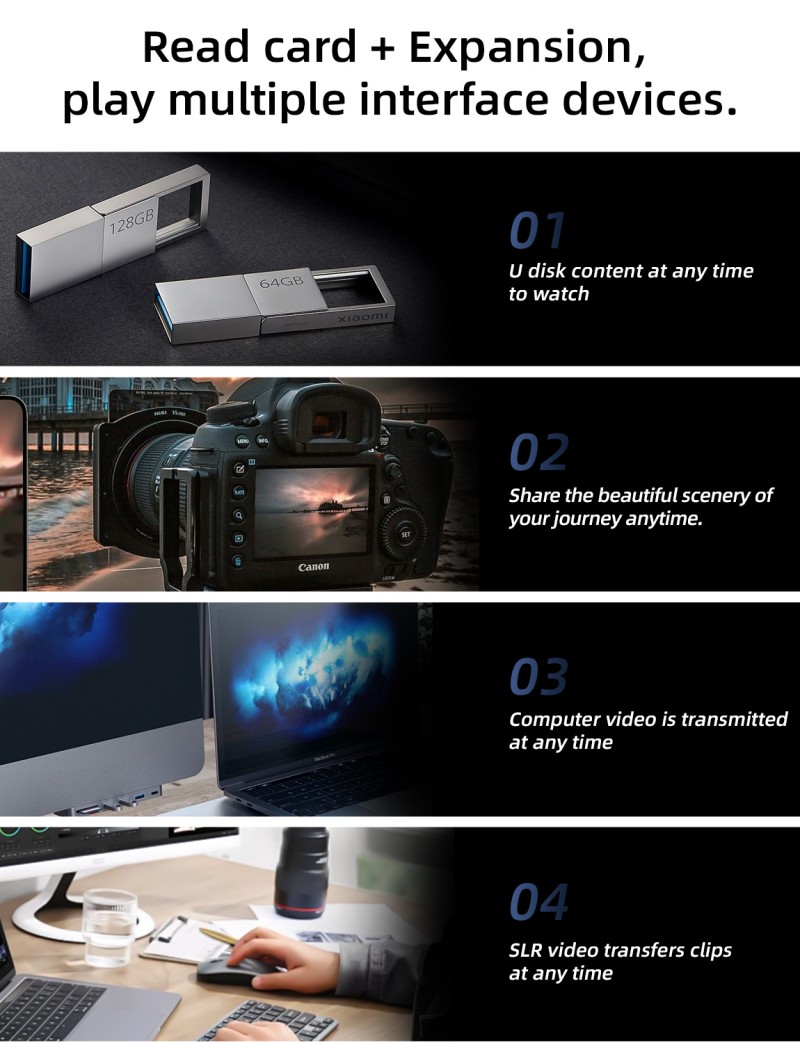 The compact design fits easily into a pocket, camera bag, or briefcase. It allows instant export of camera and phone footage during outdoor shoots, quickly expands devices for file processing during meetings, and makes organizing family photos efficient and convenient.