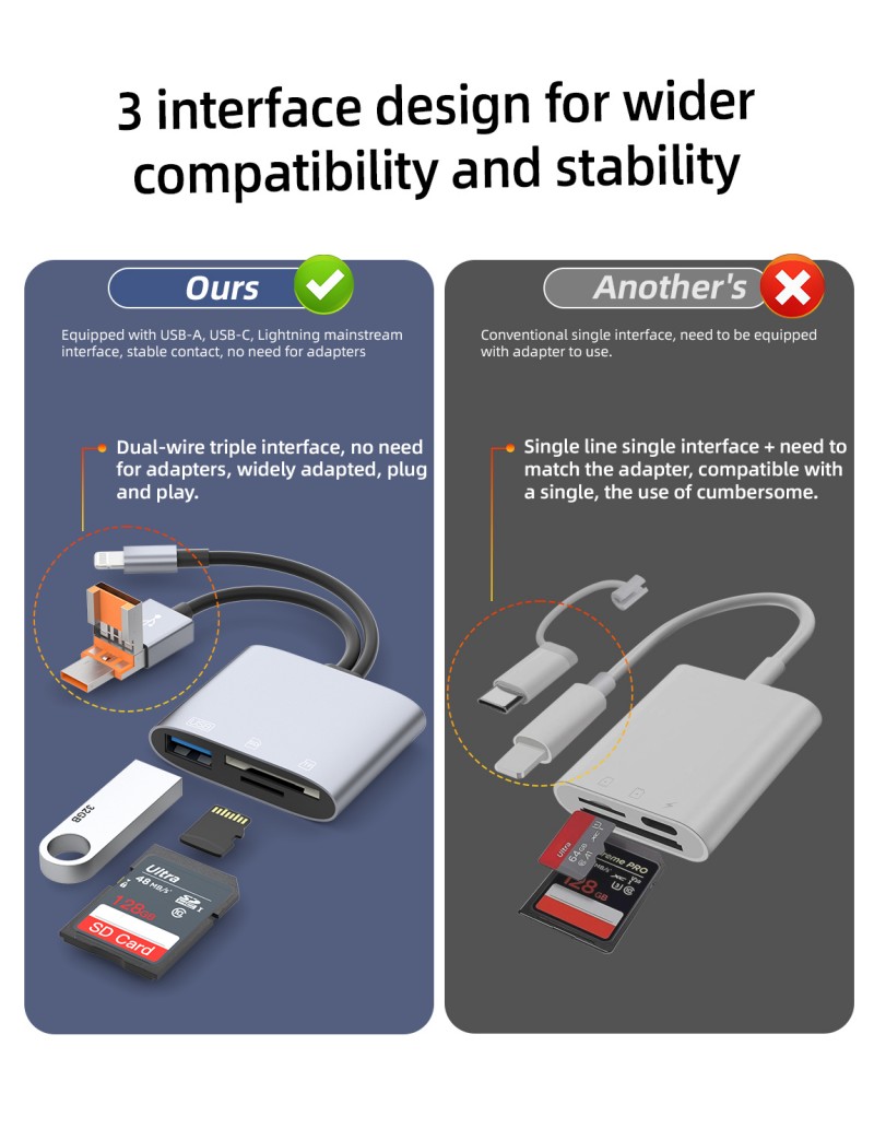 To address the pain points of incompatible device interfaces, frequent switching of memory card reading, and limited operation of small-screen devices, ZOIOT's 3-in-1 Multi-function Card Reader provides a precise solution with "full interface coverage + functional collaboration" - the USB interface is compatible with various computers, the Lightning interface seamlessly connects to iPhone/iPad, and the Type-C interface is compatible with Android phones/tablets. One device can connect to mainstream terminals, allowing data transmission to say goodbye to "device barriers."