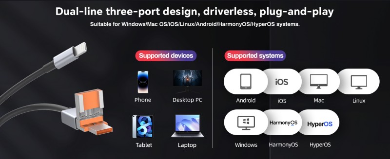 USB expansion, unlimited peripheral connectivity: The included USB female connector supports simultaneous connection of a USB flash drive, keyboard, and mouse, turning your phone/tablet into a lightweight office terminal. While on a business trip, use your phone to connect a USB flash drive to access meeting materials, quickly reply to emails with the keyboard, and precisely manipulate spreadsheets with the tablet's mouse. The user experience rivals that of a laptop, allowing you to efficiently handle work even on a small screen.
