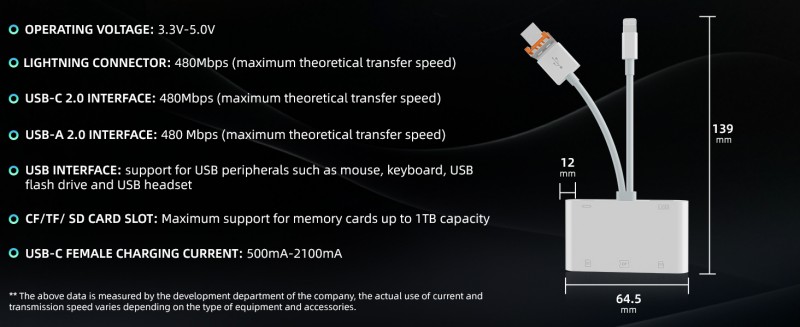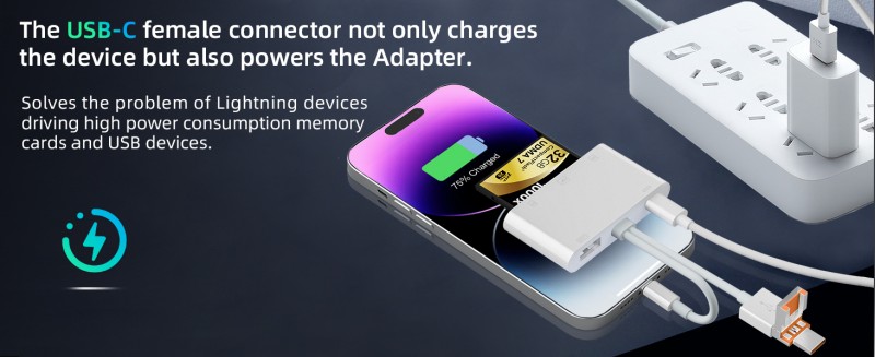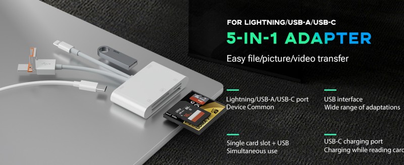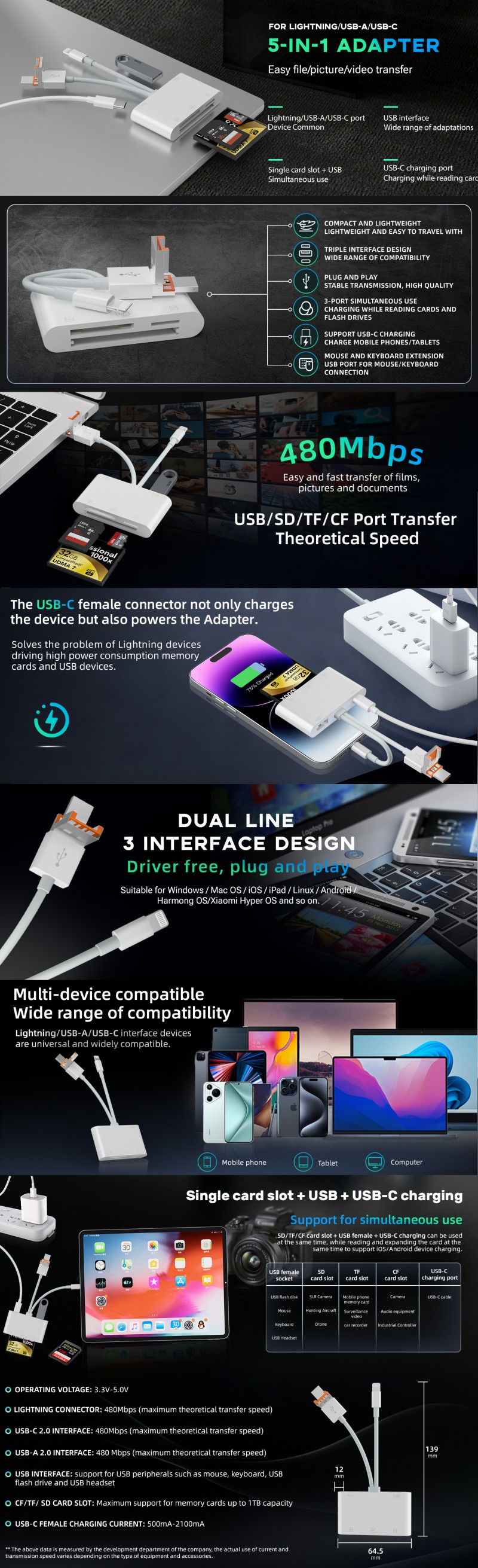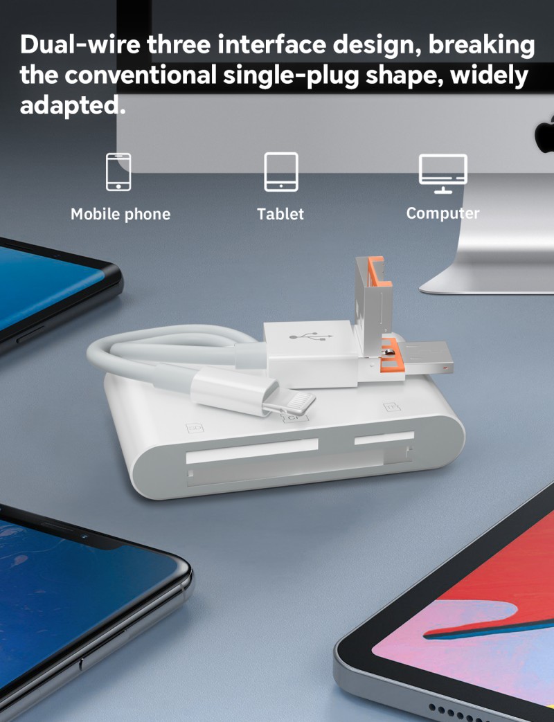 ZOIOT's Multi-function CF Card Reader Expander offers full compatibility with USB, Lightning, and Type-C interfaces, including CF, SD, and TF memory cards. It features a USB expansion port (supporting USB flash drives, keyboards, and mice) and a Type-C charging port for plug-and-play operation, requiring no drivers. From professional camera CF cards to mobile phone TF cards, from transferring data between multiple devices to charging while in use, this one-stop solution solves data transfer, peripheral expansion, and battery life challenges. It's the perfect pocket-sized data hub for photographers and mobile professionals.