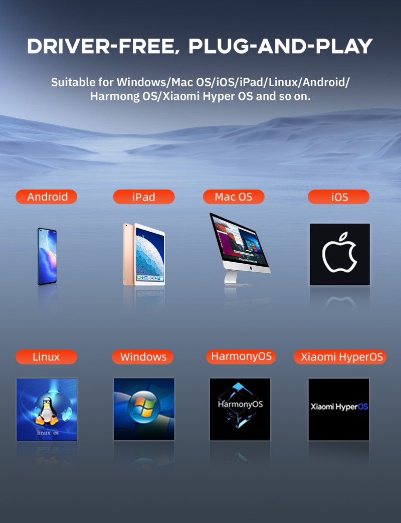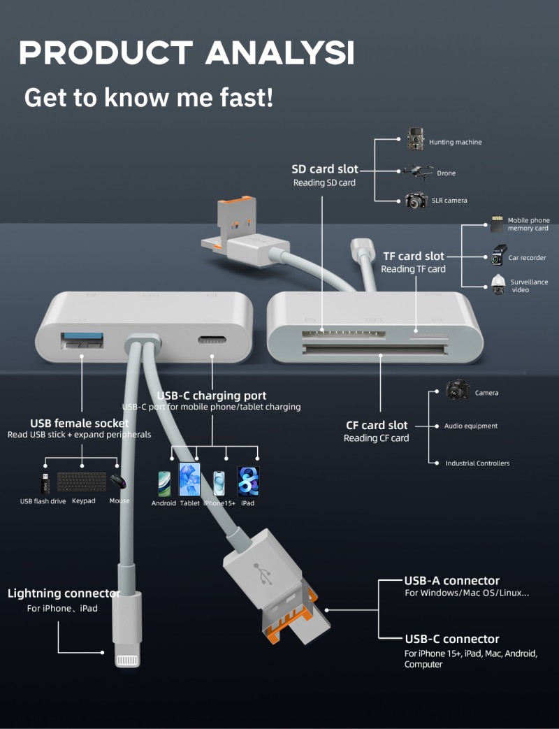 Plug-and-play compatibility across all operating systems: No driver installation required; it instantly recognizes iOS, Android, Windows, or macOS devices when plugged in, making it easy for both adults and children to use. Whether you're using an iPhone to directly read a camera's CF card or an Android tablet to access data from a USB drive, just plug it in and go! Easy to use.