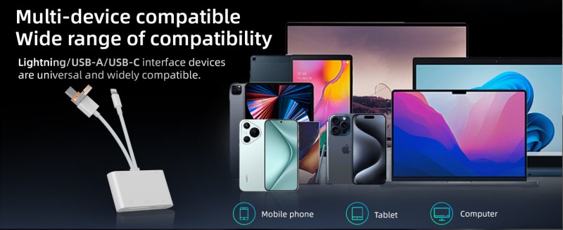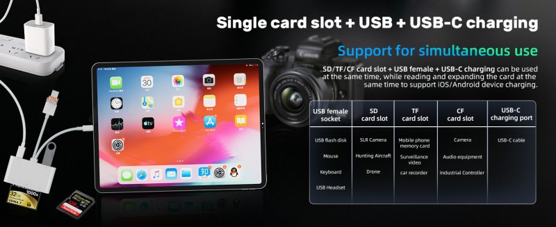The compact design easily fits into a camera bag, briefcase, or pocket. Professional photographers can instantly access CF cards while shooting outdoors, business travelers can use their tablet as an external keyboard, and parents can connect a USB drive to transfer data while accompanying their children through online classes. This all-in-one data expander, with its triple capabilities of "data access + peripheral expansion + battery life," allows any device to break free from port limitations, becoming your go-to productivity tool for simpler, more efficient, and more flexible data processing.