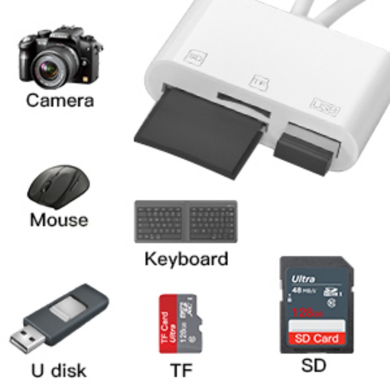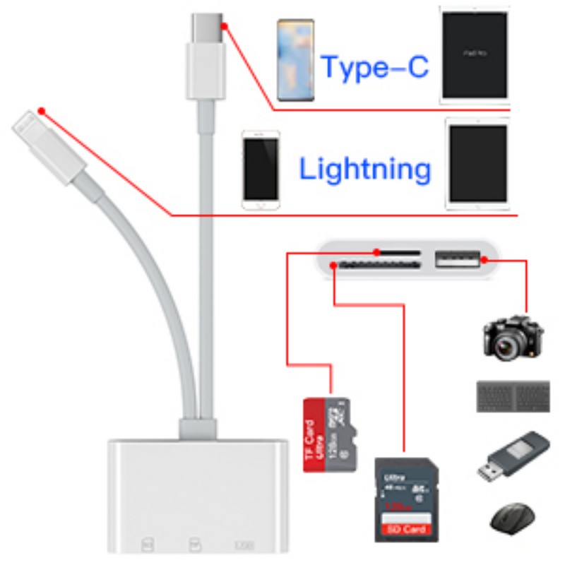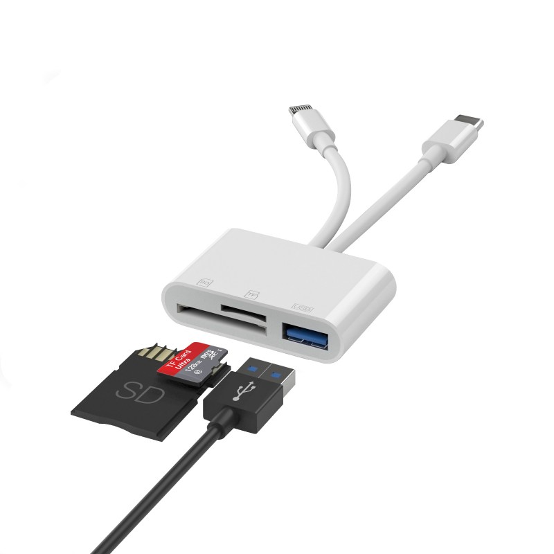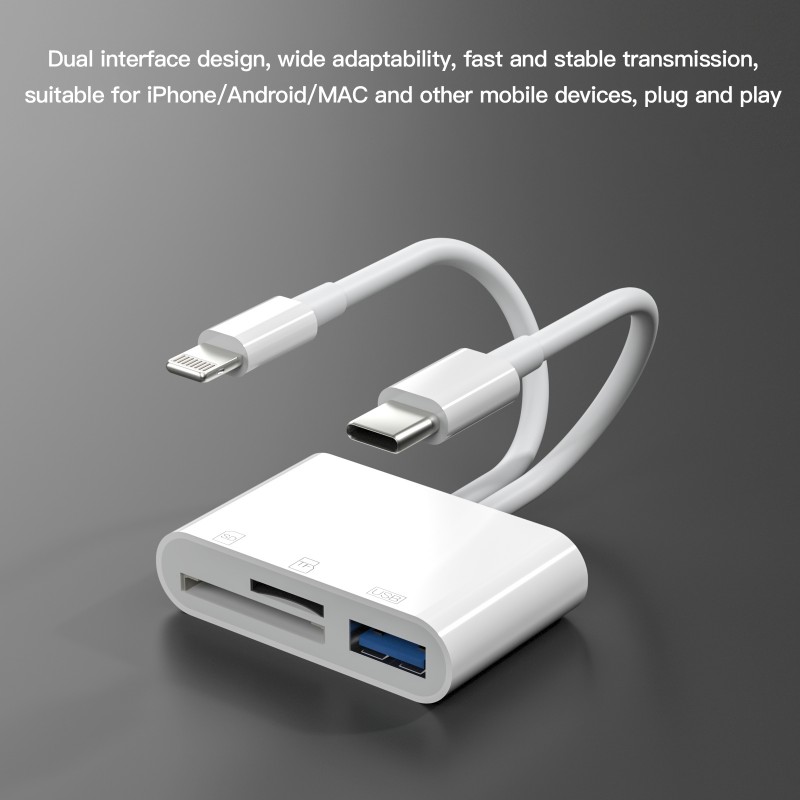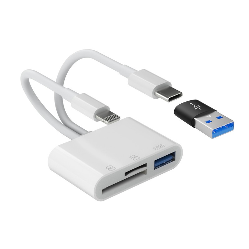 ZOIOT's Multi-Function Expansion Card Reader integrates USB, Lightning, and Type-C interfaces with a USB female connector. It supports simultaneous SD and TF card reading, and is plug-and-play, requiring no drivers. It connects multiple devices for fast access to memory card content, while also allowing for expansion with USB flash drives, keyboards, mice, and other peripherals, transforming your phone or tablet into a lightweight office terminal. It's a versatile data assistant for photography enthusiasts and mobile workers.