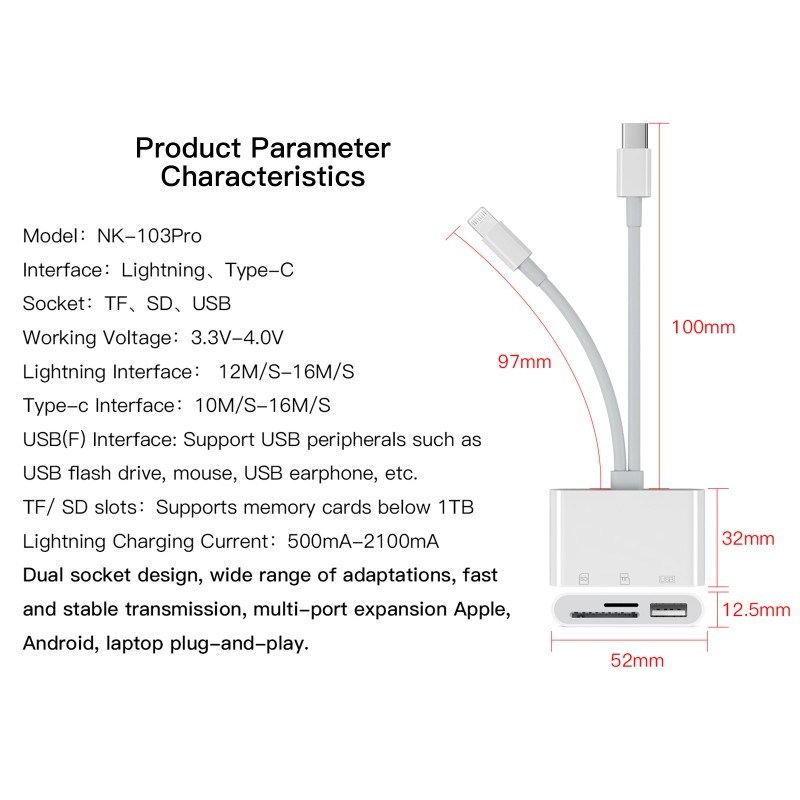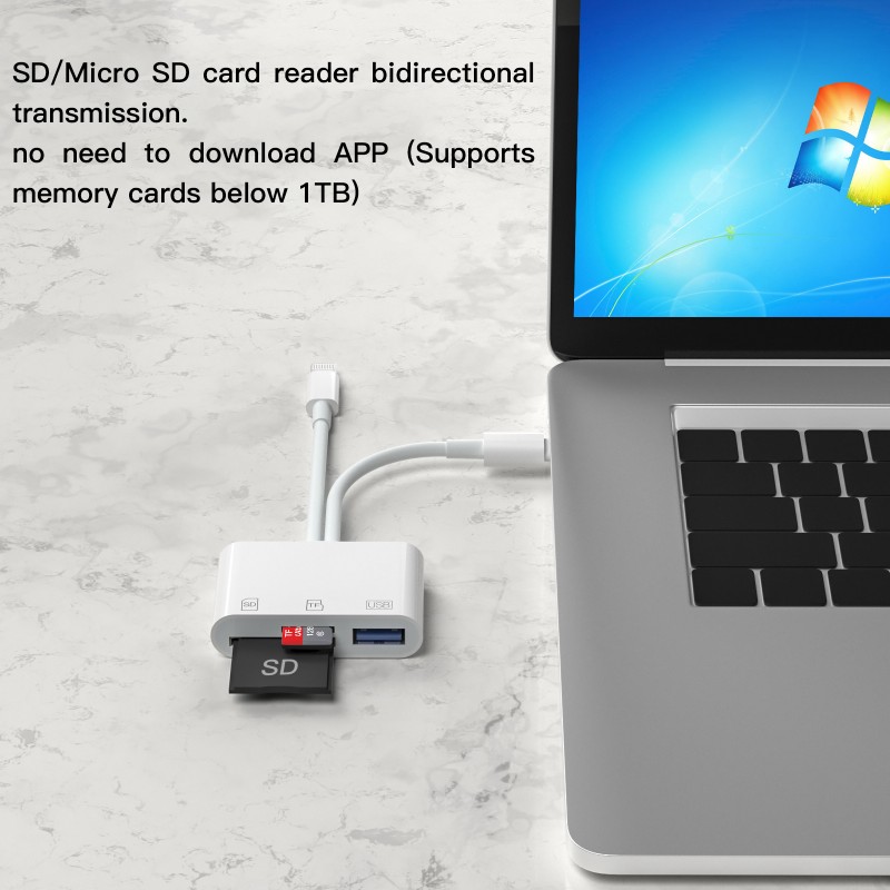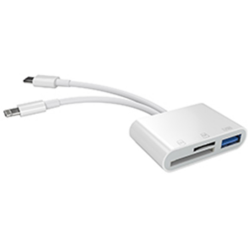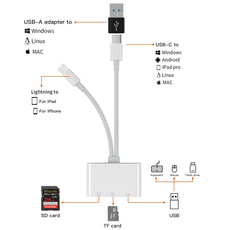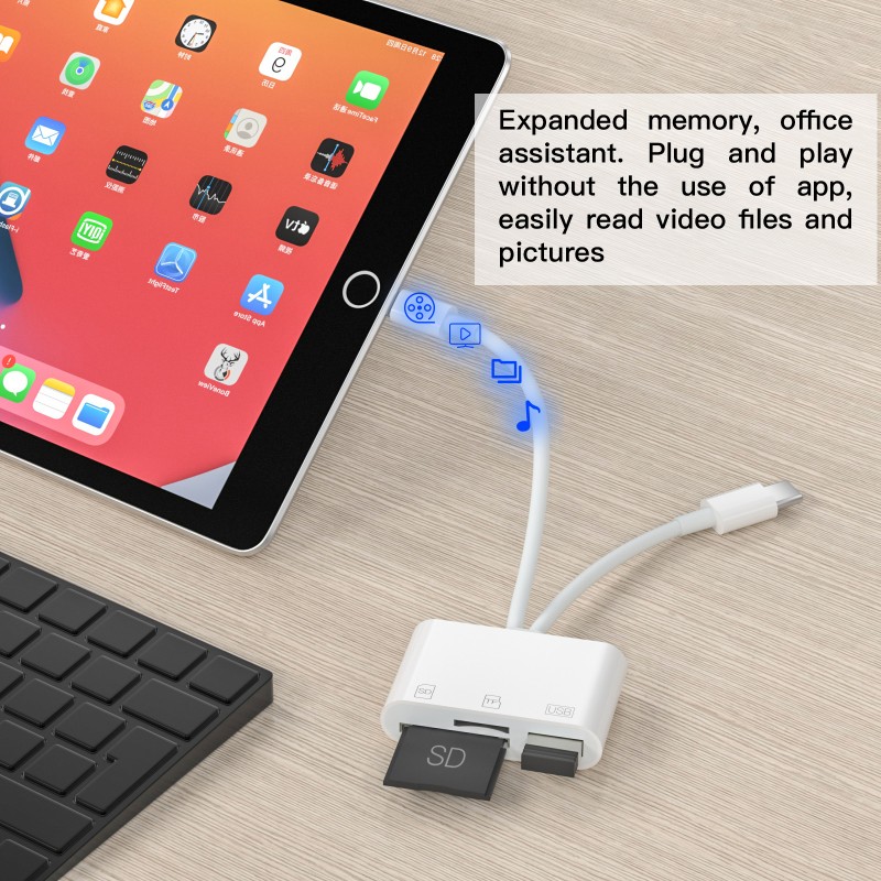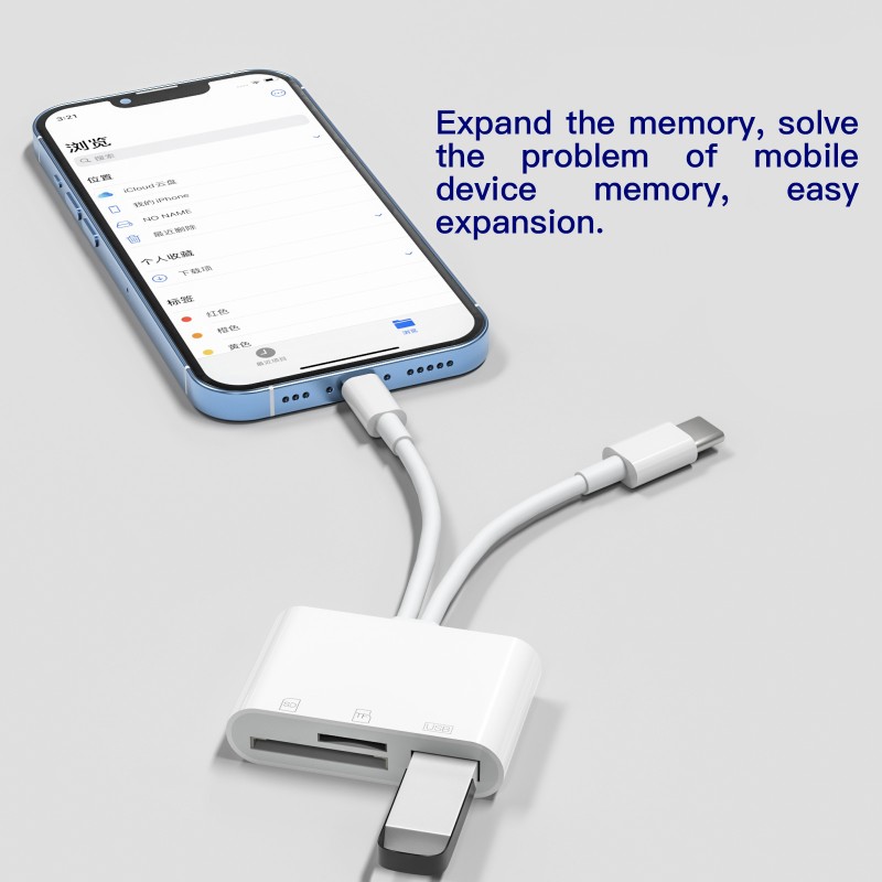 ZOIOT's Multi-Function Expansion Card Reader integrates USB, Lightning, and Type-C interfaces with a USB female connector. It supports simultaneous SD and TF card reading, and is plug-and-play, requiring no drivers. It connects multiple devices for fast access to memory card content, while also allowing for expansion with USB flash drives, keyboards, mice, and other peripherals, transforming your phone or tablet into a lightweight office terminal. It's a versatile data assistant for photography enthusiasts and mobile workers.