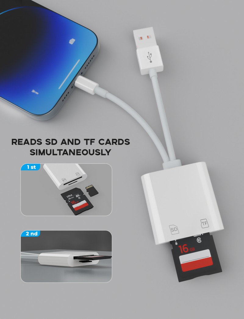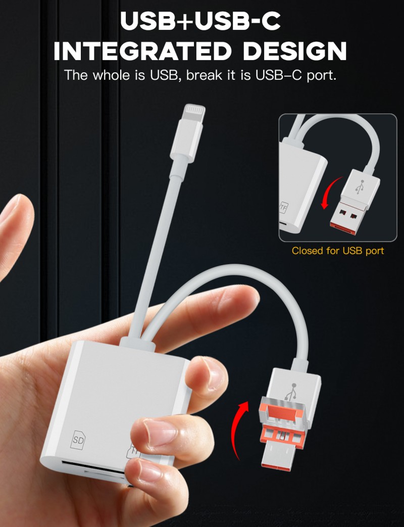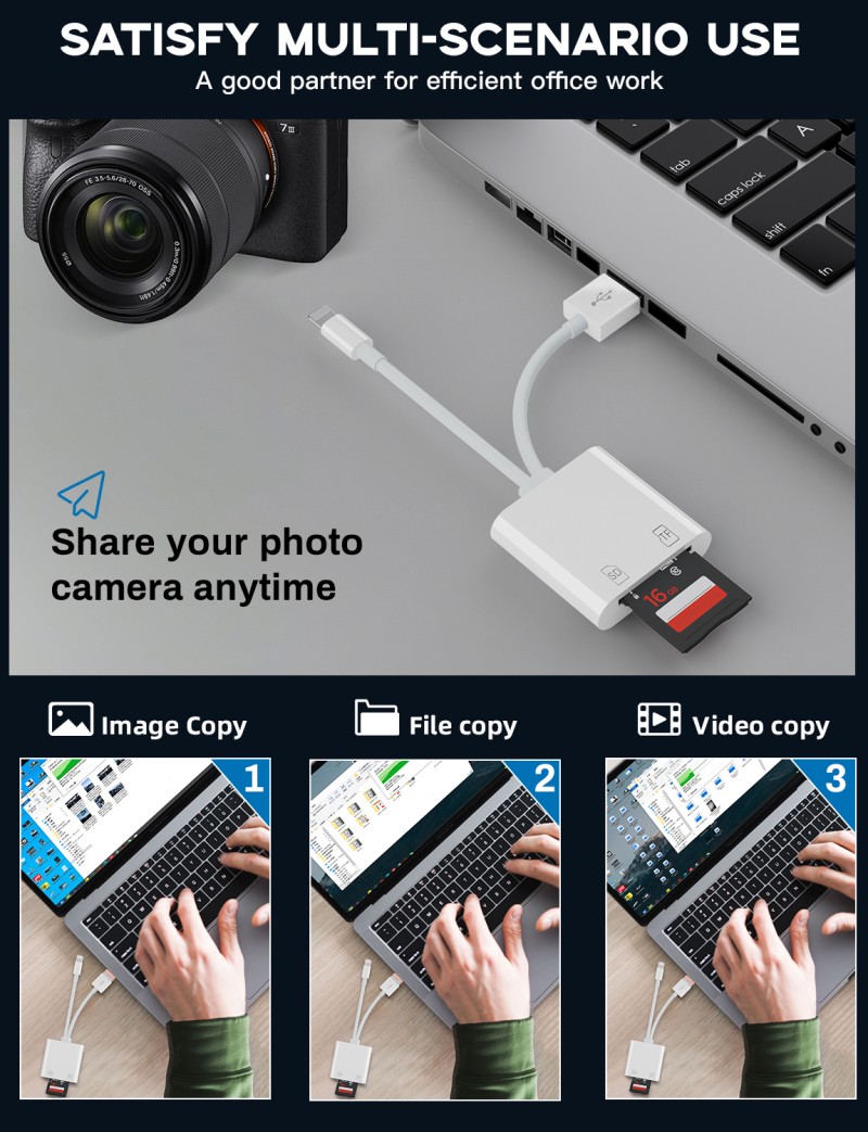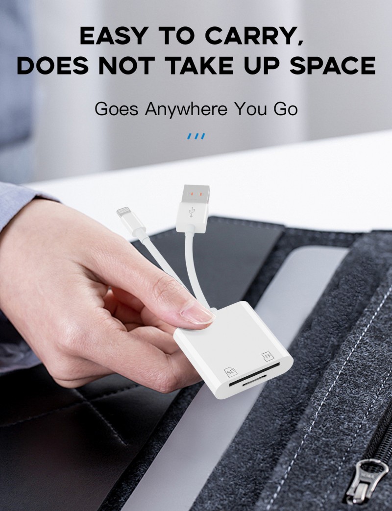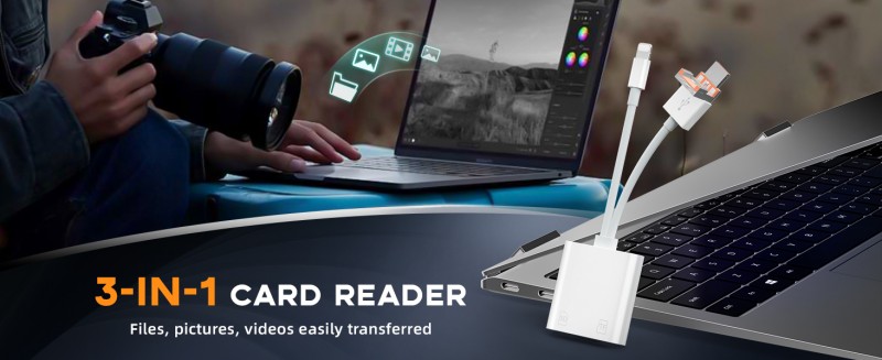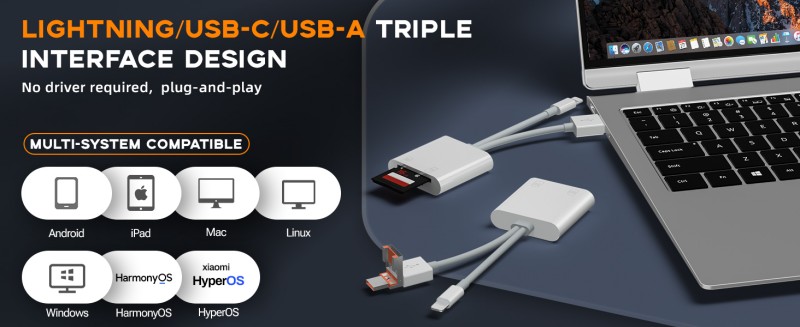 ZOIOT's USB/Lightning/Type-C 3-in-1 Card Reader addresses the pain points of multiple device interfaces and the frequent switching between memory card readers. Its comprehensive USB/Lightning/Type-C card reader offers dual-card simultaneous reading. The USB port adapts to traditional devices like computers, the Lightning port seamlessly connects to iPhones and tablets, and the Type-C port covers Android devices and the latest digital gadgets. This single device is compatible with all major devices, eliminating the need for separate card readers for different devices.